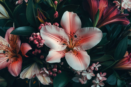 Beautiful floral arrangement featuring pink lilies and various flowers, perfect for spring decor, with lush green foliage and a dark background adding depth