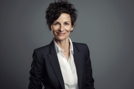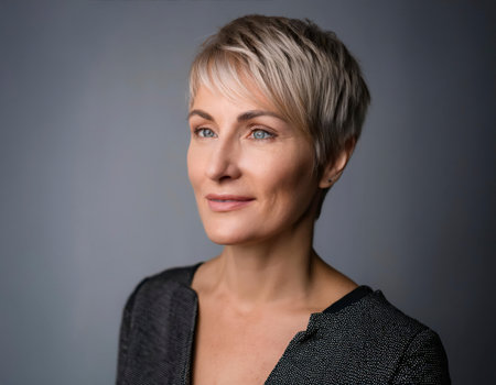 Profile headshot portrait of beautiful 40 years old woman in black wear on gray background