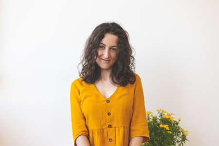 A woman and a pot with a flowering plant, a smiling girl in a yellow dress sits against the background of a white wall, indoor plant