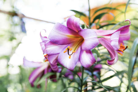 Lily flowers on a blurry background on a sunny June day in the countryside.