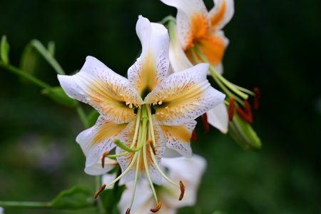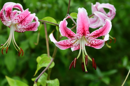 Speciosum lily flowers. Liliaceae perennial plants. Beautiful downward blooming flowers with red spots on the petals from July to September. The root is edible and medicinal.
