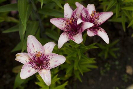 Pale pink flowers lily summer day on the background of green grass and earth.