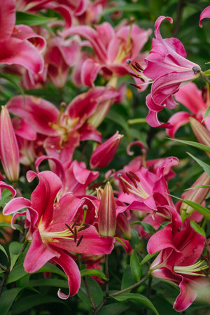 group of fresh pink violet lily flower buds and blooming with green leaves in botany garden natural park