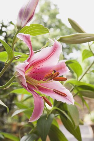 Beautiful pink flower on a blurred background. Royal lily in summer scenery. Photo with a shallow depth of field.