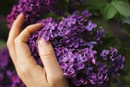 Purple voilet lilac flowers with womans hand as a background. Selective focus