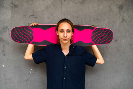 Caucasian teenage boy holding longboard looking at camera. Copy space.