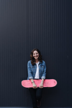 Portrait of laughing young Caucasian girl in casual clothes, on dark gray background outdoor portrait. People lifestyle concept. Hold pink skateboard looking aside