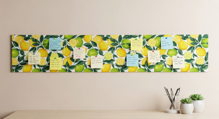 Lemon-themed bulletin board with sticky notes on a wooden desk