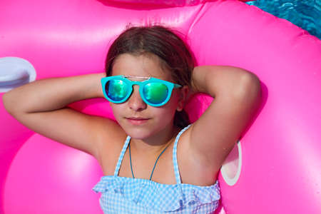 Portrait of little girl wearing sunglasses on inflatable flamingo swim float, enjoying pool party in summer