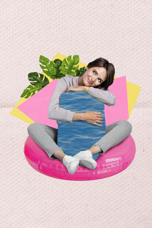 Creative poster collage of cute young female hugging embrace ocean water sea waves traveler dream summer vacation weekend relax have rest