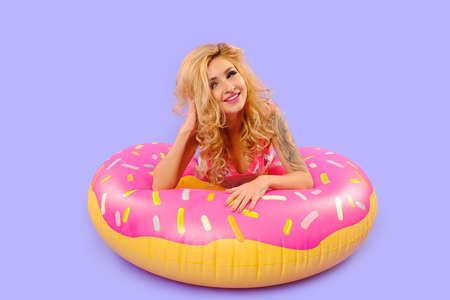 Beautiful sexy tattooed girl in studio isolated with the inflatable big donut. Dressed in a swimsuit with embroidered cakes