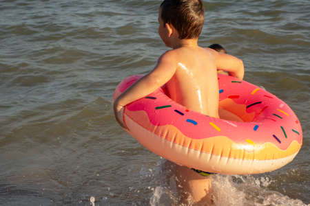 A cheerful boy 5 years old swims in the sea on an inflatable ring in the form of a donut on a sunny day