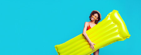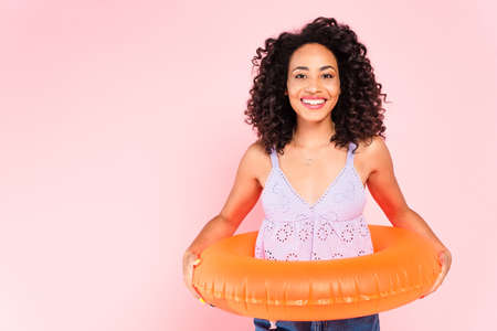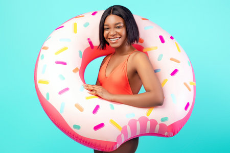 Portrait of happy millennial black lady in swimwear standing with donut shaped inflatable ring on blue studio background