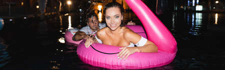 Website header of young woman looking at camera while swimming with inflatable ring near boyfriend in pool at night