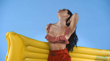sexy woman in swimsuit touching hair while holding inflatable mattress isolated on blue