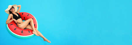 Young woman wearing stylish black bikini on inflatable ring in swimming pool, space for text. banner design