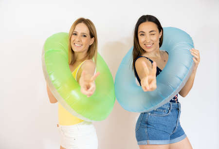 Portrait of a two pretty girls dressed in swimsuits holding ring inflatable isolated over white background