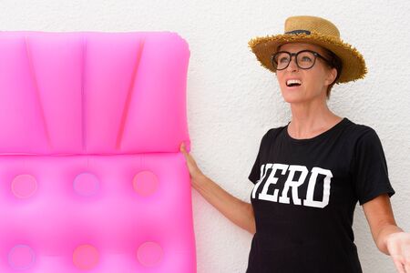 Confused tourist nerd woman holding air mattress and standing against white background outdoors while looking lost