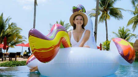 Happy woman in swimwear fun and relax on floaties inflatable unicorn mattress