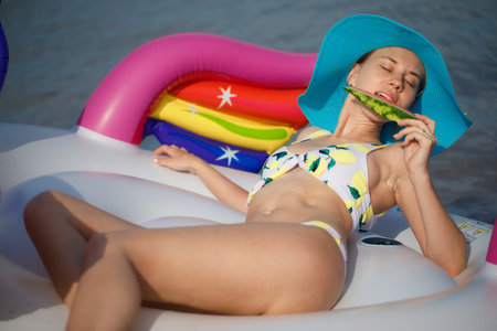 woman with hat relax on the beach on inflatable pool toy unicorn and eat watermelon