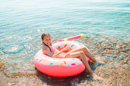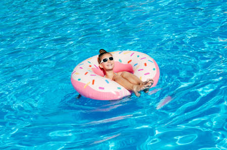 Cute smiling little girl in swimming pool with rubber ring. Child having fun on vacation in summertime