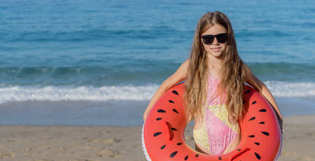 Cheerful child girl with a rubber ring on the beach on a sunny day