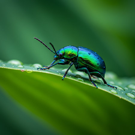 Close-up of an iridescent beetle on a leaf, surrounded by dew drops, capturing the natural beauty and vibrant colors of the insect in a serene setting.