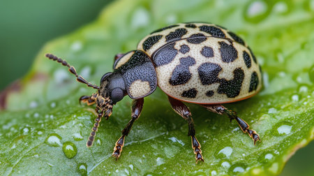 This detailed close-up showcases a vibrant beetle perched on a green leaf adorned with water droplets, highlighting its unique spots and natural beauty.
