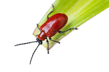 insects of europe - beetles: top view of scarlet lily beetle ( Lilioceris lili german Lilienhaehnchen) on a lily leaf isolated on white background