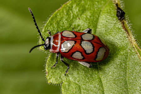 Close up view of a red colored beetle belonging to the Labidostomis genus.