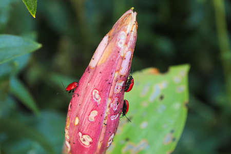 red bug on white calla lily flower in green nature background