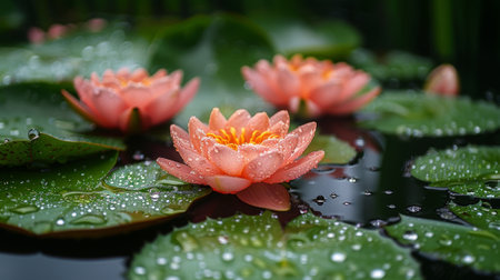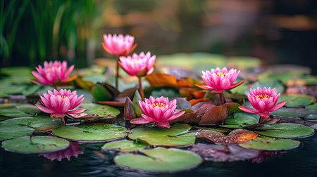 Experience the serene beauty of a tranquil pond scene, featuring delicate pink water lilies blooming among lush green leaves, reflecting on the calm surface.
