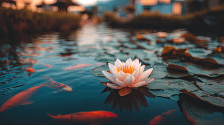 Cinematic texture of a tranquil pond with blooming lily pads at dusk