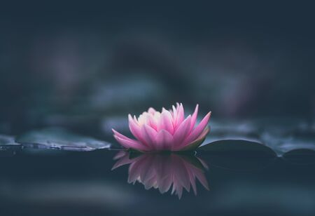 Beautiful pink lotus flower blooming in the pond with reflection.