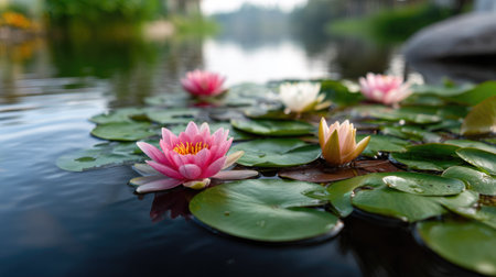A tranquil scene featuring blooming water lilies floating on a calm pond, reflecting soft colors in the gentle light, perfect for nature lovers and relaxation themes.