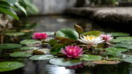 Immerse yourself in the serene beauty of a tranquil pond featuring vibrant pink and white water lilies gracefully floating among lush green leaves.