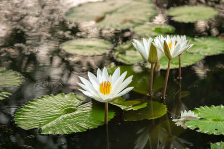 White water lilies blooming in the pond
