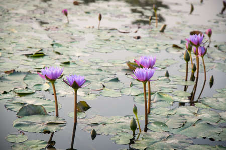 Nymphaea Cyanea Roxb. Low light and copy space. Top view of Water Lilly light purple flower bloom with leaves in the pond.