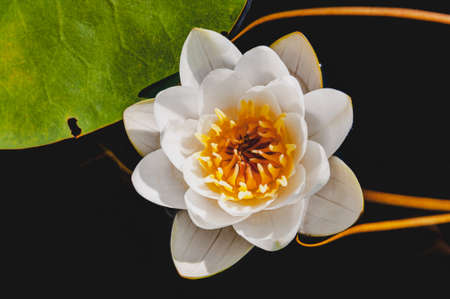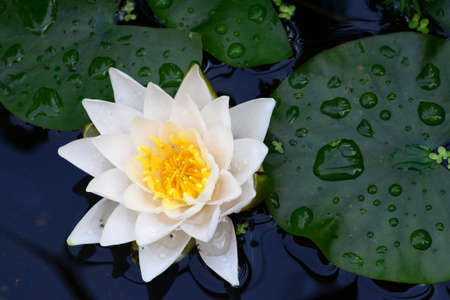 White water lily close up in a pond. Beautiful nature background. Floral backdrop