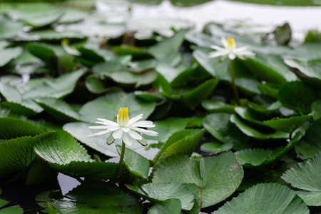 White water lilies and lotus leaves blooming in the water