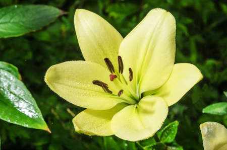 A gorgeous yellow wild Lily flower with dewdrops. Summer flower meadow. Selective focus.