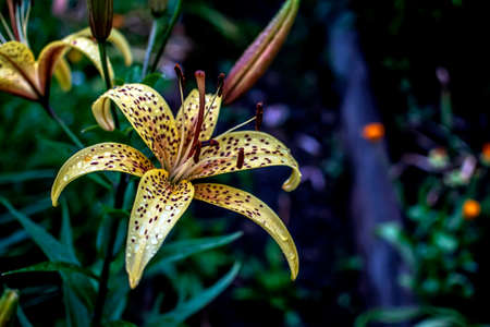 bright beautiful blooming yellow tiger lilies with raindrops in the garden