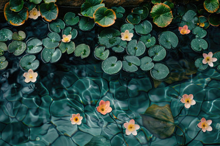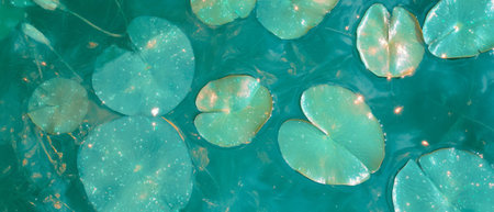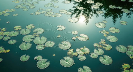 Lively water lily pads floating gently on a tranquil surface reflecting bright sunlight
