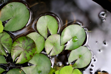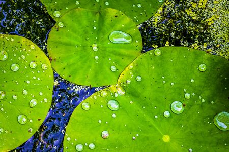 Water lily leaves with water drops, closeup. Green waxy leaves floating on water, after rain.