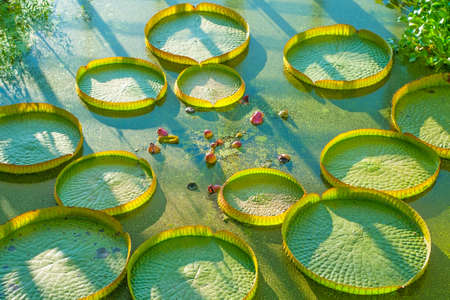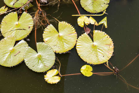 Top view of water lilie leafs in a pond