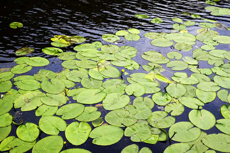 green leaves of water lilies on the water near the river bank close-up background backdrop