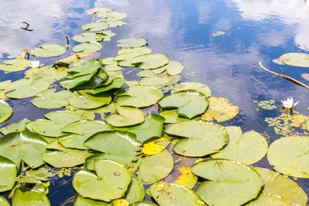 Water lilies and lilies on water close up in open air. Picturesque photo a part of pond with flower in focus. Calm water smooth in windless weather. Tranquil vegetation in natural environment
