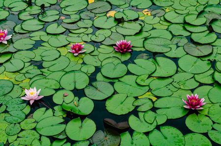 Tranquil pond with overlapping water lily leaves