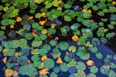 Water lily in the lake with yellow leaves on the water surface