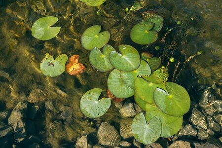 Green round leaves of aquatic plants covering the surface of a pond